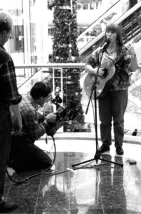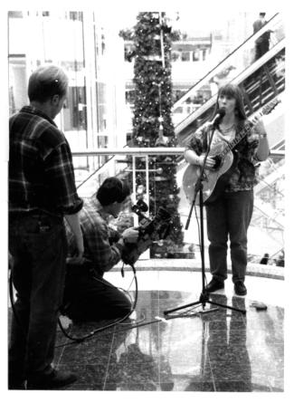 Elaine receives great acclaim for her voice, songs and lively stage presence. She was featured by HTV on an ecology series, where she was interviewed and sang one of her own songs, on the mystical heights of Glastonbury Tor! She was also filmed for Wire TV, in Kingston’s Bentalls Centre (pictured oppostie). She came second in a televised, live performance song contest too, at Leicester’s Y Theatre, where she was the only solo performer! Elaine was a cast member of "London's Finest" female singer / songwriter group "Girls With Guitars UK" and performed regular London showcases with the other cast members, when the group was active in the early 2000s. She created her Kindred Spirit Duo and Kindred Spirit Band line-ups from the mid 1990s.