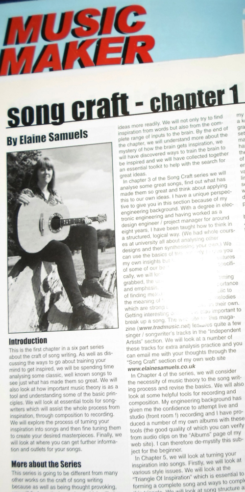 Article Series on Song-writing Elaine was commissioned to write a six-part series of articles (see the picture, right) especially for Music Maker Magazine in 2005 called "Song Craft", dealing with song-writing right from how to get ideas, how to train your mind, how to turn your inspiration into songs and then fine-tune them into masterpieces.